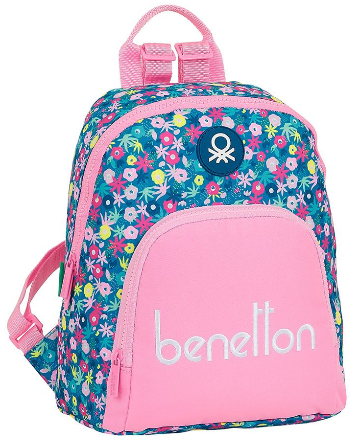Růžový batoh s barevnými detaily a znakem Benetton a nastavitelnými ramenními popruhy s kovovou sponou.