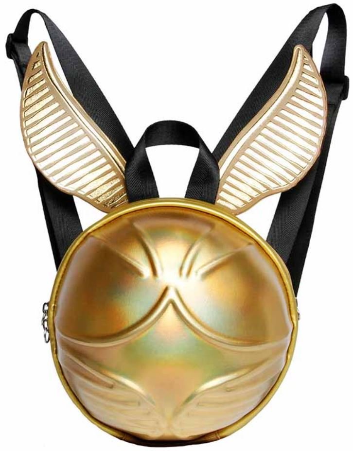 Mini batoh zlaté barvy inspirovaný létajícím míčkem Zlatonkou.