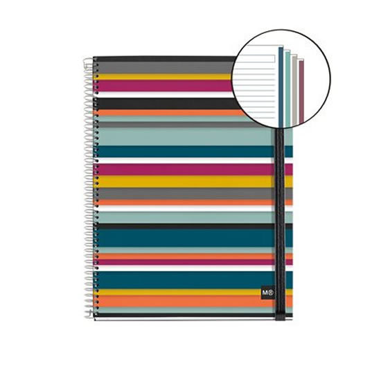 Atraktivní poznámkový blok s pruhovanou PP obálkou v kroužkové vazbě. Ochrana stránek díky uzavírání na gumičku. Papír 90 g, 120 listů. Zvýrazněné záhlaví, děrování pro zařazení do pořadače, mikroperforace pro snadné vytržení listu. Strany rozlišeny do čtyř barev. Formát: A5. Vnitřní listy: linkované.