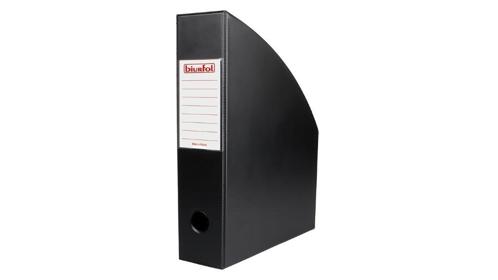 Wykonany z kolorowej folii PVC, wewnątrz usztywniony tekturą. Format A4 o ściętych bokach. Wyposażony w kieszonkę z wymienną etykietą opisową na grzbiecie. Okrągłe wycięcie na palec pozwalające na łatwe wysuwanie pojemnika. Szerokość grzbietu 7 cm. prečítať celé