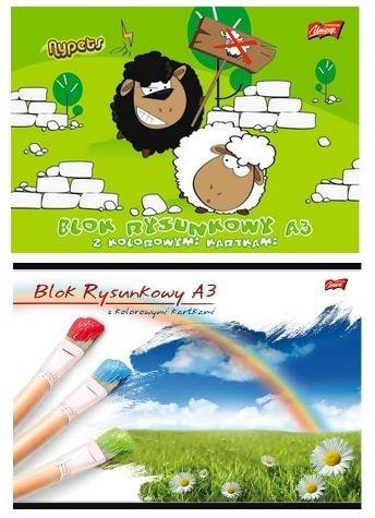 Blok zawiera 16 kolorowych kartek o gramaturze 80 g/m2. Kartki barwione w masie w kolorach żółty, różowy, pomarańczowy, czerwony, jasnozielony, ciemnozielony, jasnoniebieski, ciemnoniebieski. Okładka kredowa o gramaturze 115g/m2 wykorzystuje najnowsze motywy wzornicze UNIPAP. Dla podkreślenia, jakości wykończenia okładka jest dodatkowo nabłyszczana. Całość usztywniona tekturowym podkładem. 10 sztuk w opakowaniu zbiorczym.