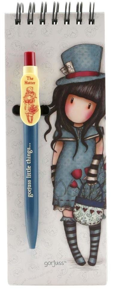 Gorjuss - Notes z długopisem - The Hatter. Pięknie zdobiony urzekającą grafiką "Kapelusznika" notes z długopisem. Zachowany w odcieniach błękitu i granatu z pięknymi detalami takimi jak: drukowane zegarki kieszonkowe i karty do gry. Wewnątrz znajduje się70 błękitnych karteczek w linię, do...