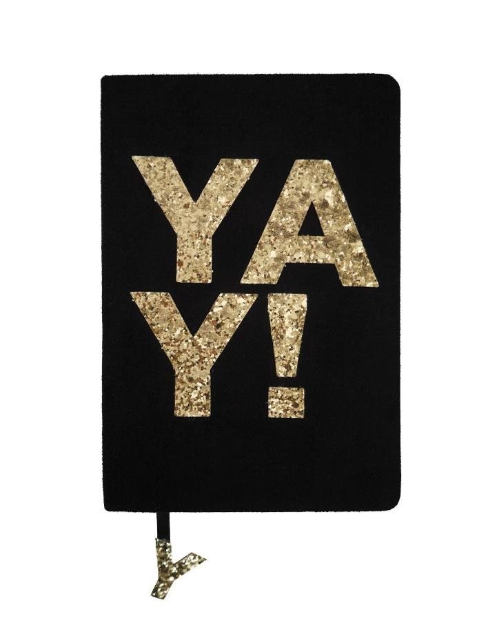 Format A5.96 kartek.Oprawa tekstylna.Brokatowa oprawa.Linia.Kolor czarny ze złotym napisem YAY. prečítať celé