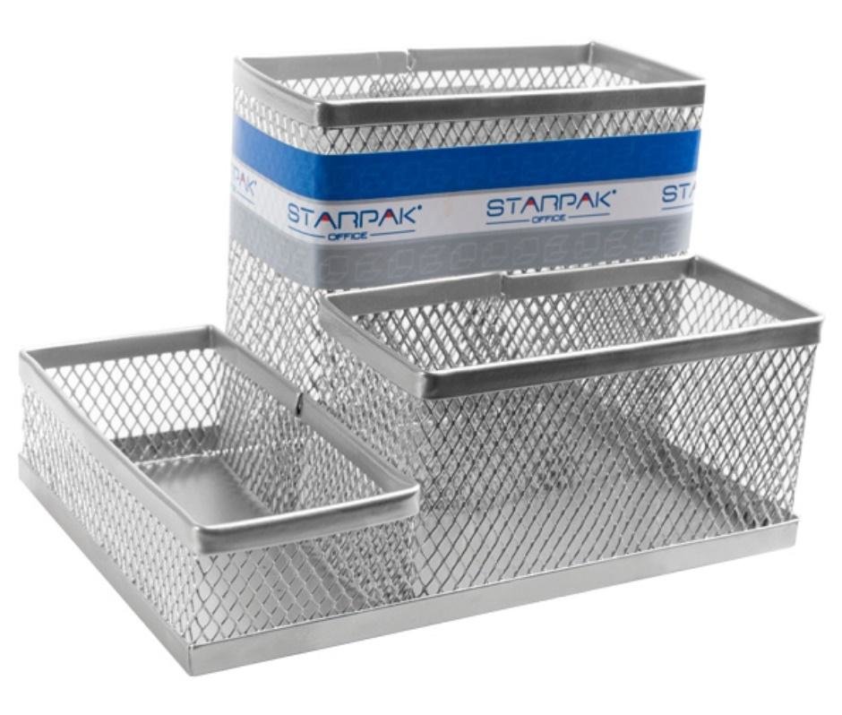 Organizer metalowy na biurko z kolekcji Starpak dedykowanej dla szkoły i biura. Bardzo praktyczny stojak z przegródkami, wprowadzający na biurku porządek wśród przyborów piśmienniczych i akcesoriów biurowych. Zapoznaj się również z innymi produktami Starpak! Organizer w kolorze srebrnym. Wykonany z metalu.