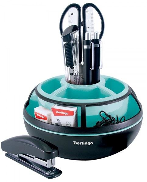 Stylowy obrotowy organizer biurkowy Berlingo "Instinct" z wypełnieniem. Design składający się z połączenia dwóch kontrastujących kolorów. Wysokiej jakości plastik, błyszcząca powierzchnia. Organizer obraca się o 360 stopni. Wypełnienie obejmuje: ołówek, automatyczny długopis, zszywacz, nożyczki, nóż, linijkę, spinacze do papieru, gumkę, zszywki. Kolor: miętowo-czarny.
