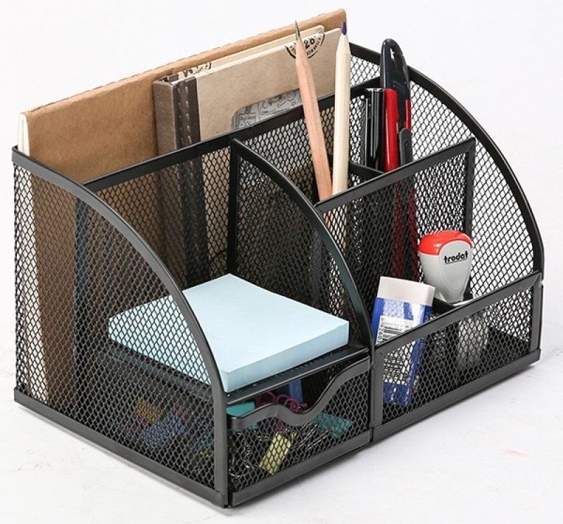 przybornik na biurko, wykonany z metalowej siateczki powlekanej lakierem    1 przegroda na korespondencję    2 komora na artykuły piśmienne    2 komory na drobne akcesoria biurowe (gumki, spinacze, itp.)    1 komora na karteczki    1 szufladka na drobne akcesoria    posiada gumowe nóżki...