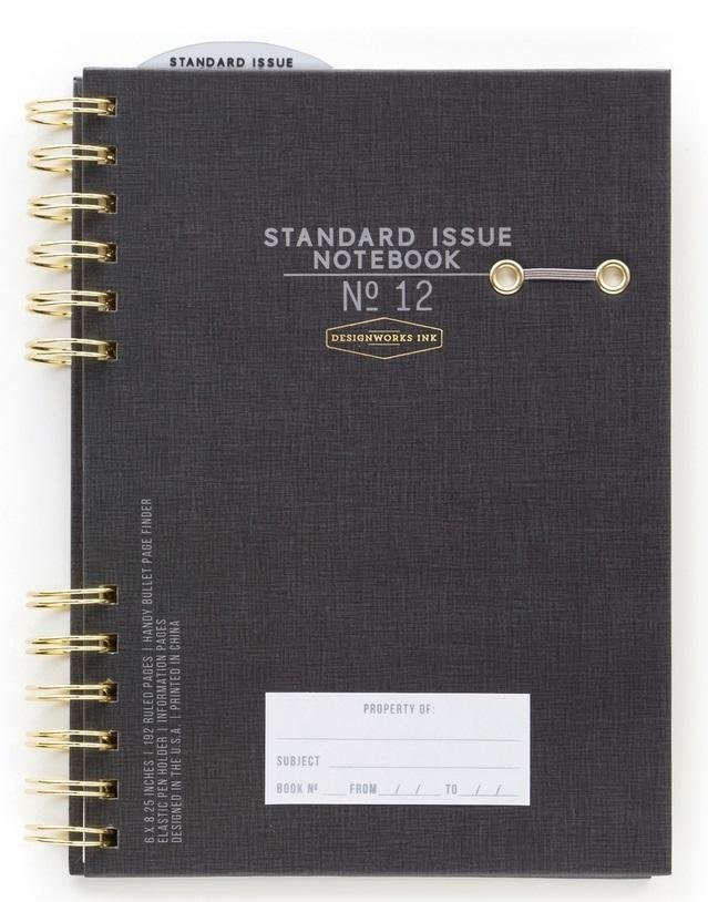 Notatnik Standard Issue No.12 Black | DESIGNWORKS INK to praktyczny prezent dla zorganizowanej kobiety.Notatnik ma twardą okładkę z uchwytem na długopis i miejscem na Twoje dane i akcentem ze złotej folii.192 strony z nagłówkami dzień / miesiąc w rozmiarze 15 x 21 cm. Łączony podwójną sprężyną,...