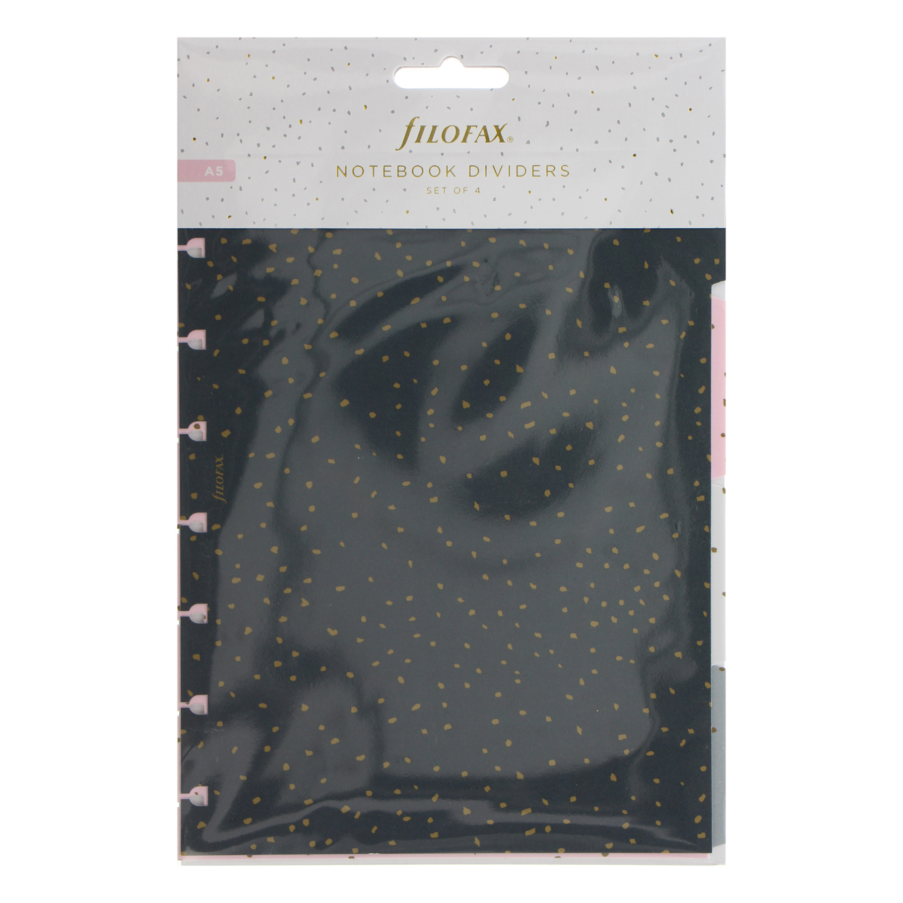 Plánujte a oslavujte! Dodejte Vašemu Filofax Notebook nádech stylu s touto barevnou sadou čtyř odolných plastových rozřazovačů z naší kolekce Confetti, které jsou speciálně navržené aby ladily s Vašim plnitelným zápisníkem Filofax Notebook A5. Tato sada obsahuje oboustranně potištěné rozřazovače v černé, růžové, bílé a šedé barvě. Další vlastnosti 4 rozřazovače s prázdnou záložkou
