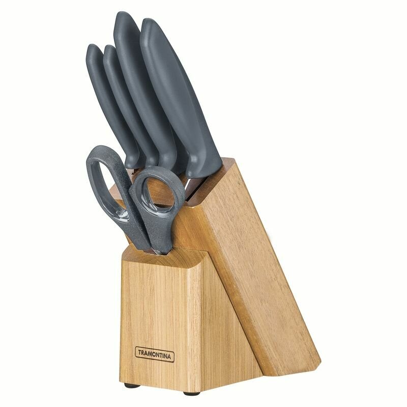 6-dielny kuchynský set Tramontina 23498/615 Plenus obsahuje:- 1x nôž na ovocie/zeleninu 7,5 cm- 1x nôž na steaky 13 cm- 1x kuchársky nôž 15 cm- 1x šéfkuchársky nôž 18 cm- 1x nožnice - drevený stojanS čepeľami z nehrdzavejúcej ocele a čiernymi polypropylénovými rukoväťami s pohodlným úchopom....