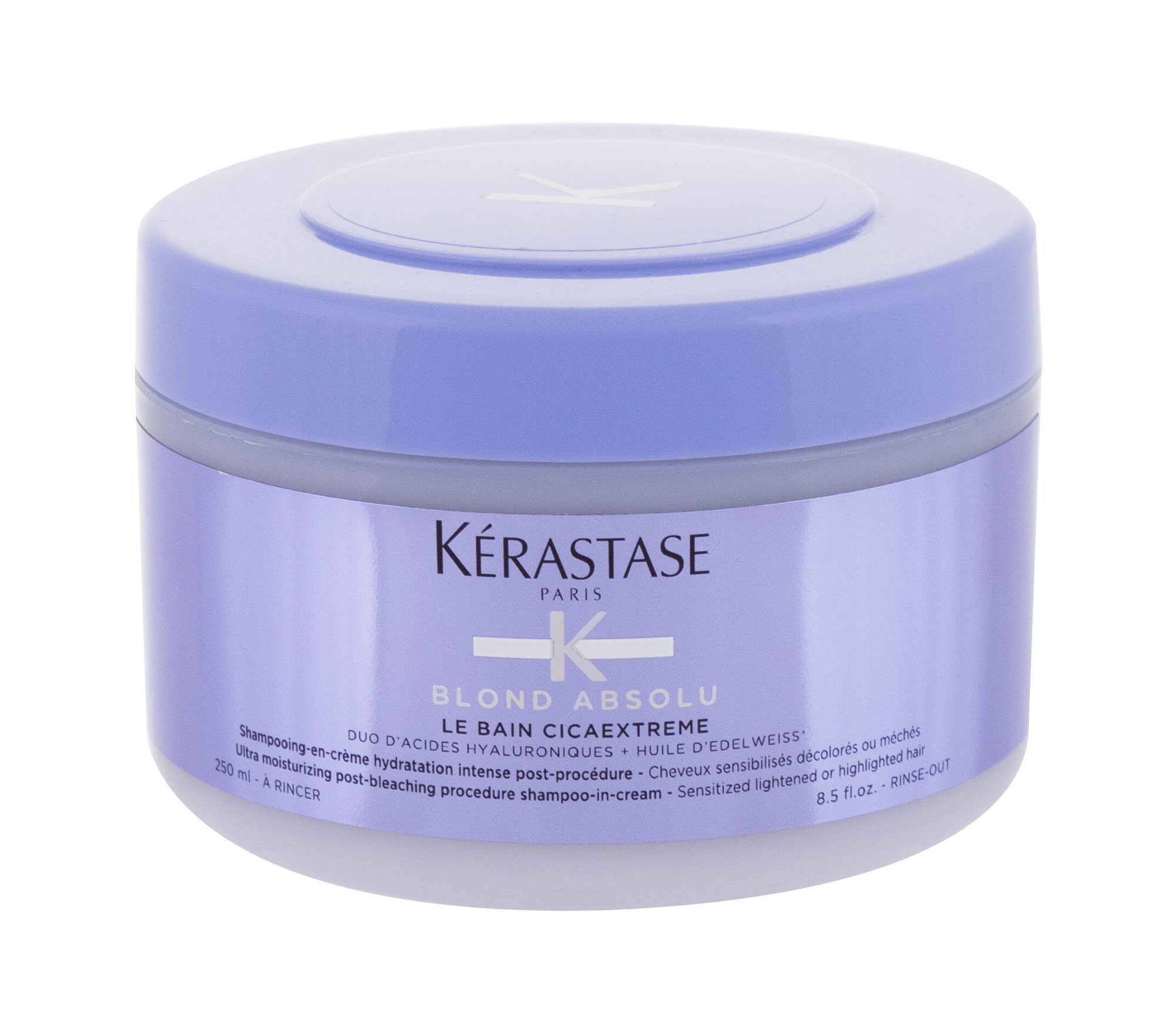 Krémový šampon pro blond vlasy Kérastase Blond Absolu Le Bain Cicaextreme Shampoo-In-Cream má speciálně navržené složení tak, aby vlasům poskytl nenahraditelnou profesionální péči. Při kontaktu s mokrými vlasy vytváří velmi hustou pěnu, hloubkově vlasy hydratuje a po opláchnutí nejsou vlasy zatížené.