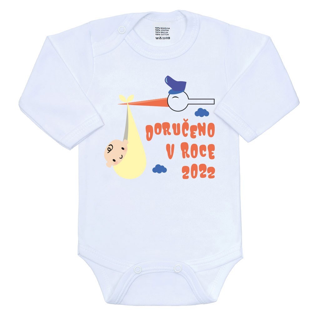 Originální bavlněné kojenecké body s dlouhým rukávem New Baby, s vtipným nápisem DORUČENO V ROCE 2022. Barvy použité k potisku jsou certifikované a vhodné pro miminka. Je vyrobeno z příjemného a kvalitního materiálu, ve kterém se bude Vaše miminko cítit příjemně. Body má zapínáni na cvočky na...