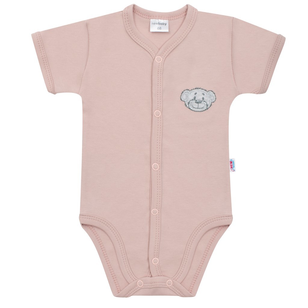 Nápadité bavlněné kojenecké body s krátkým rukávem české značky New Baby BrumBrum pro miminka. Body je zdobeno roztomilou nášivkou s medvídkem. Nášivka je podlepená látkou proti poškrábání. Zapínání na cvočky po celé délce a mezi nožičkama usnadňuje oblékání a přebalování. Složení: 100% bavlna.
