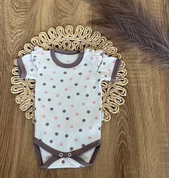 Kojenecké body, kr. rukáv Mamatti, zap. u krku, Puntík - smetana/hnědý lem, vel. 80; 80 (9-12m)