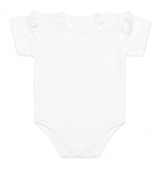 Kojenecké body kr. rukáv s krajkovým volánkem, Aurelia, bavlna Mrofi, bílé, vel. 68