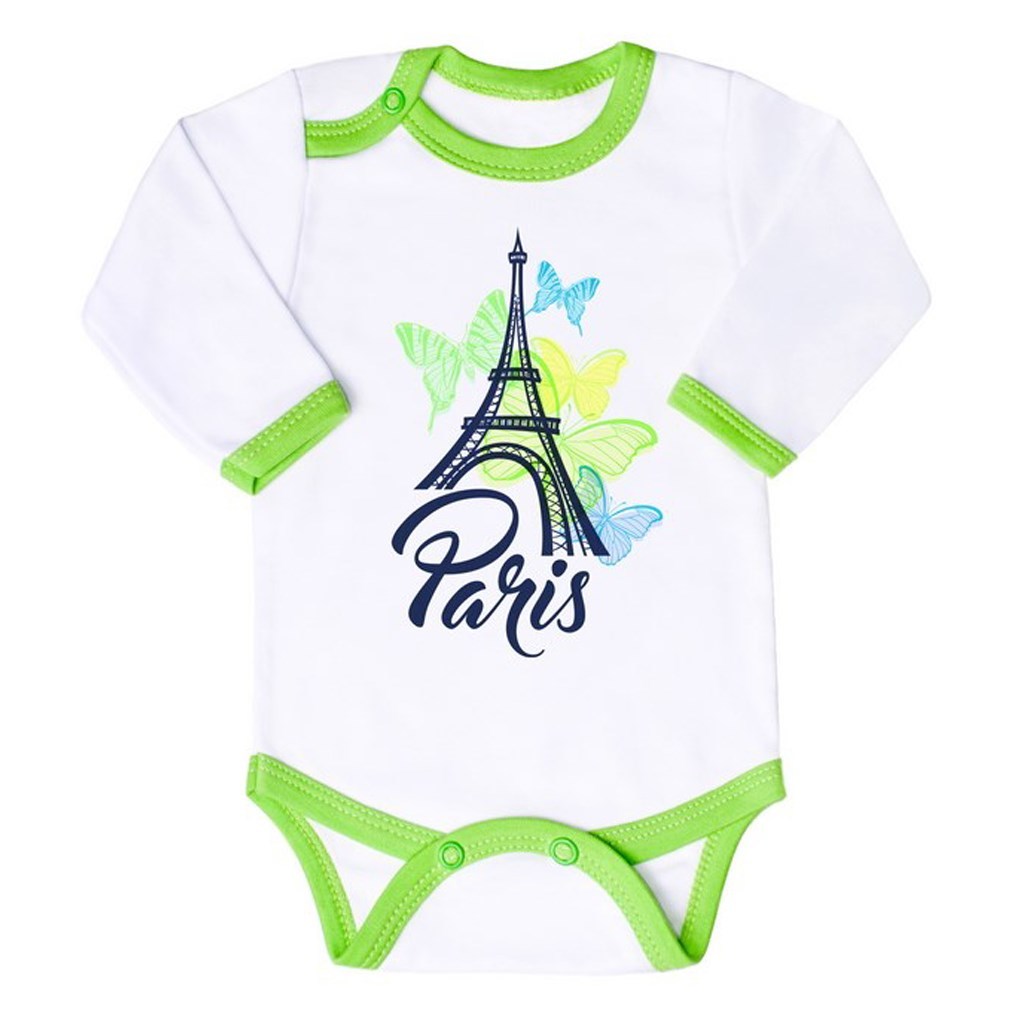 Bavlněné kojenecké body s dlouhým rukávem New Baby z kolekce Towns. Body zdobí potisk Eiffelové věže s motýlky a nápis Paris. Body má barevný lem. Zapínání na cvočky na ramínku a mezi nožičkami. Rozměry: obvod kolem hrudníku cca 50 cm, délka rukávu cca 26 cm, celková délka cca 42 cm.