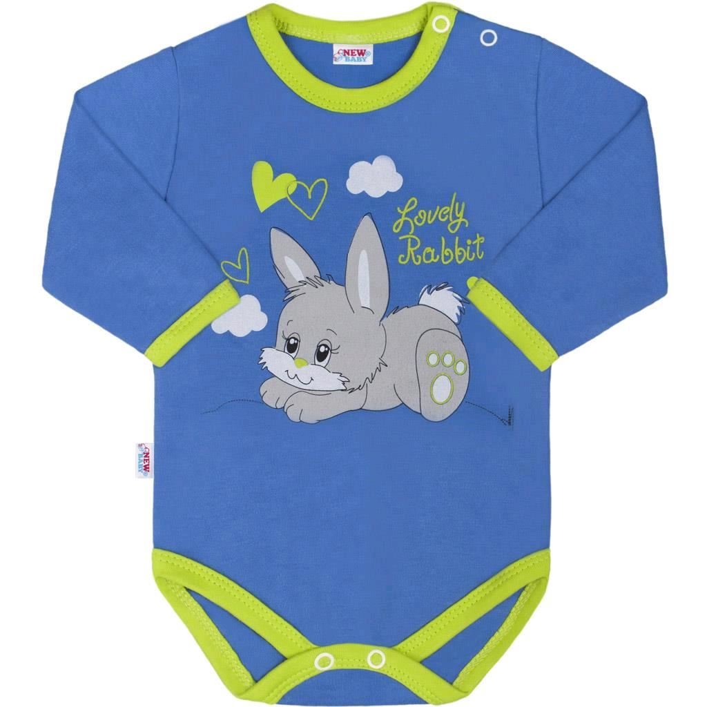 Bavlněné kojenecké body s dlouhým rukávem New Baby Lovely Rabbit pro miminka. Dětské body je v krásné pastelové barvě s barevným lemováním a je zdobeno obrázkem roztomilého králíčka a s nápisem Lovely Rabbit. Praktické zapínání na cvočky na ramínku a mezi nožičkami. Složení: 100% bavlna.