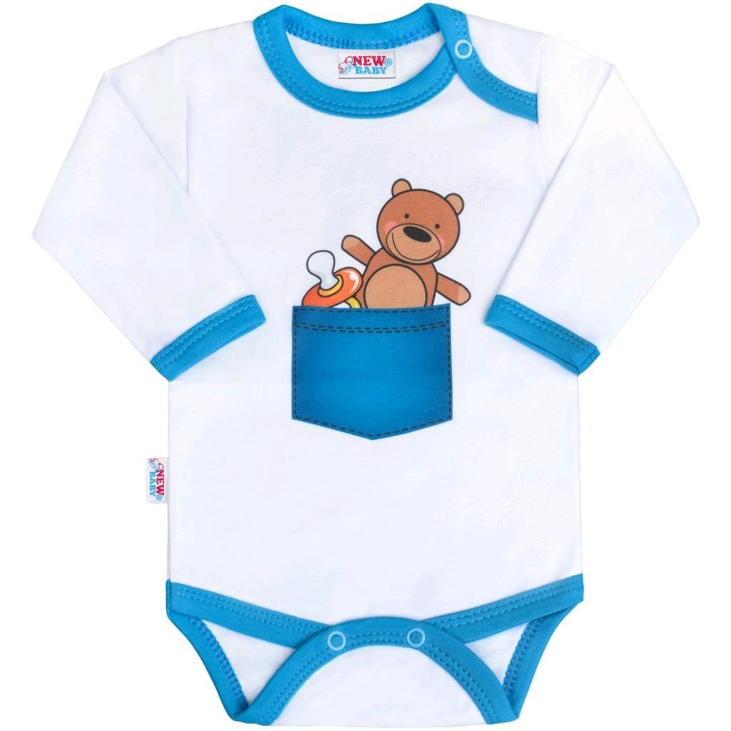 Originální bavlněné kojenecké body s dlouhým rukávem New Baby, s obrázkem medvídka. Body má kolem krčku, nožiček a ručiček barevné lemování. Barvy použité k potisku jsou certifikované a vhodné pro miminka. Je vyrobeno z příjemného a kvalitního materiálu, ve kterém se bude Vaše miminko cítit...