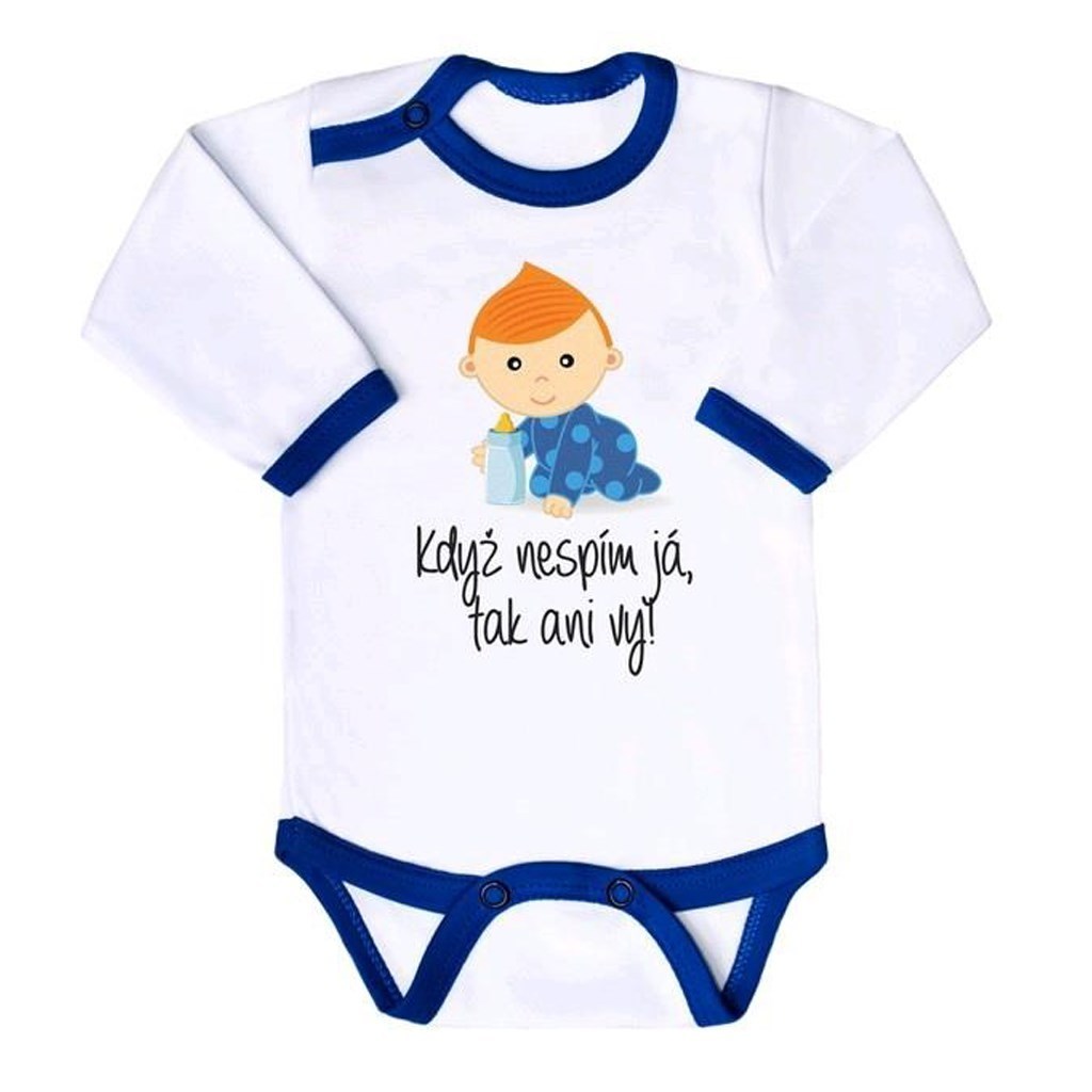 Originální bavlněné kojenecké body s dlouhým rukávem New Baby, s vtipným nápisem Když nespím já, tak ani vy! A obrázkem roztomilého chlapečka. Body má kolem krčku, nožiček a ručiček barevné lemování. Barvy použité k potisku jsou certifikované a vhodné pro miminka. Je vyrobeno z příjemného a...
