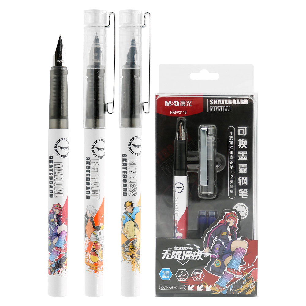 Plnicí pero v motivu Skateboard zaujme každého školáka (3 designy).špička z nerezavějící oceli a hladkým psanímgumový úchop při psaní neklouže (vhodné pro praváky i leváky)průhledné víko se sponou ve stříbrné barvěsoučástí balení jsou 2 ks bombičkyUvedená cena je za jedno balení.barevnou variantu...