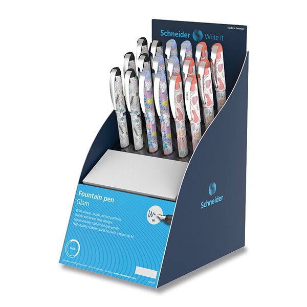 Stojánek 17 ks bombičkového pera Schneider Glam v nových atraktivních motivech. Pero je s plastickým potiskem, výrazným kovovým klipem a má kvalitní ocelový hrot s iridiovou špičkou. Standardní inkoustové bombičky.Ve stojánku je mix 3 motivů. prečítať celé