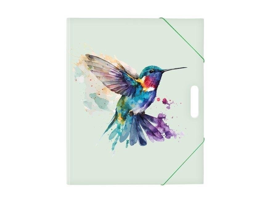 Teczka na rysunki z dobrej jakości tektury powleczonej laminatem. Zagięte rogi wewnątrz teczki pomagają w utrzymaniu rysunku wewnątrz teczki. Teczka posiada gumkę, która zabezpiecza rysunki oraz pomaga w przenoszeniu ich.Format: A4Kolor: zielonyWzór: koliberMateriał: tektura z laminatem