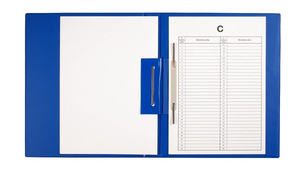 Teczka wykonana z wytrzymałej folii PVC, wewnątrz usztywniona tekturą. Wewnątrz zamontowano mechanizmy skoroszytowe umożliwiające wpięcie dokumentów. Wyposażona w uniwersalne, papierowe przekładki A, B, C, D, E bez opisu kategorii. Grzbiet o szerokości 3 cm. Na grzbiecie kieszeń z etykietą do...