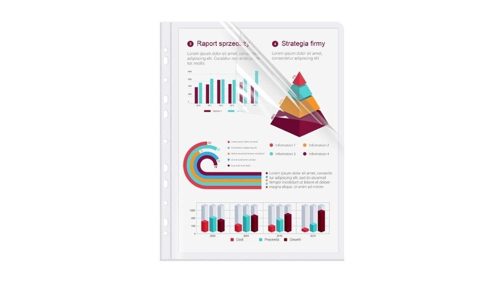 Przód i tył z przezroczystej twardej folii PVC typu 0,15. Zgrzew w kształcie litery "L". Boczna perforacja umożliwiająca wpięcie do segregatora z dowolnym ringiem. Format A4. prečítať celé
