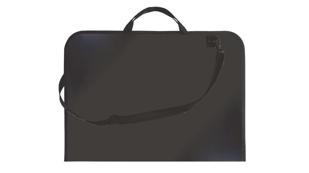 Teczka wykonana ze sztywnego tworzywa PP w kolorze czarnym. Wymiary teczki 38x52 cm umożliwiają przechowywanie prac plastycznych w formacie A3 z zapasem miejsca. Wyposażona w zamknięcie na suwak oraz materiałowe rączki i odpinany pasek na ramię. Dodatkowa kieszeń wewnątrz ułatwia utrzymanie porządku. Grzbiet o szerokości 3 cm pozwala na przechowywanie w teczce przyborów plastycznych.