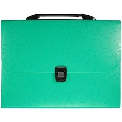 Wykonana z nieprzezroczystego, twardego polipropylenu w tłoczone, atrakcyjne wzory, przegródki pozwalające segregować dokumenty. W zestawie kolorowe kartoniki opisowe. Teczka zamykana na zamek z tworzywa, ma rączkę z tworzywa. Pakowana po 1 sztuce w woreczek foliowy. Kolor: zielony, szerokość: 330 mm, wysokość: 213 mm, wysokość z rączką: 265 mm.
