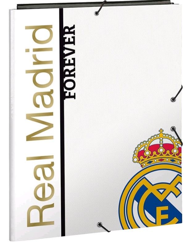 Složka ve velikosti A4 s nápisem a znakem slavného fotbalového klubu Real Madrid FC. Uzavírání na gumičky, se třemi klopy.
