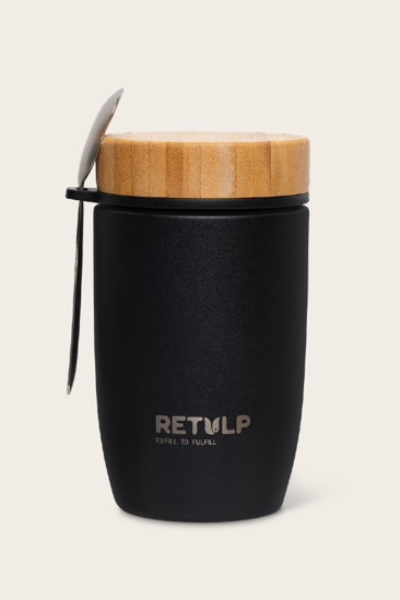 Velký termo dvoustěnný hrnek/kulatý box s bambusovým víčkem a lžicí černý 500ml RETULP