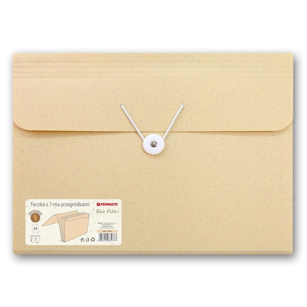 pszenicznej. Kreatywny, nowy materiał ma właściwości i zalety podobne do tradycyjnych tworzyw sztucznych. Grubość tworzywa na zewnątrz 0,6 mm, wewnątrz kolorowe przegródki o grubości 0,15 mm wykonane również z materiału zawierającego słomę pszeniczną. Wymiary: 235x325x30 mm. Teczka pakowana pojedynczo w woreczek foliowy.
