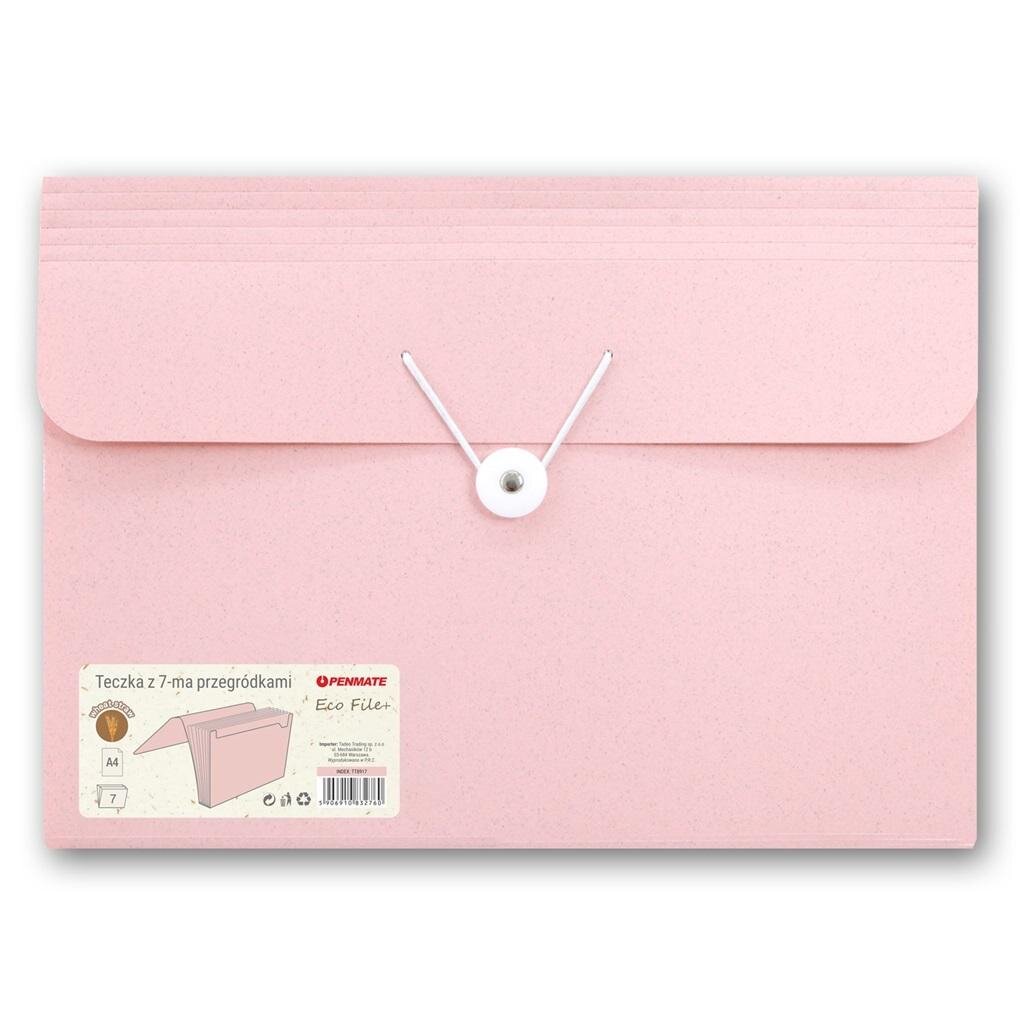 pszenicznej. Kreatywny, nowy materiał ma właściwości i zalety podobne do tradycyjnych tworzyw sztucznych. Grubość tworzywa na zewnątrz 0,6 mm, wewnątrz kolorowe przegródki o grubości 0,15 mm wykonane również z materiału zawierającego słomę pszeniczną. Wymiary: 235x325x30 mm. Teczka pakowana pojedynczo w woreczek foliowy.