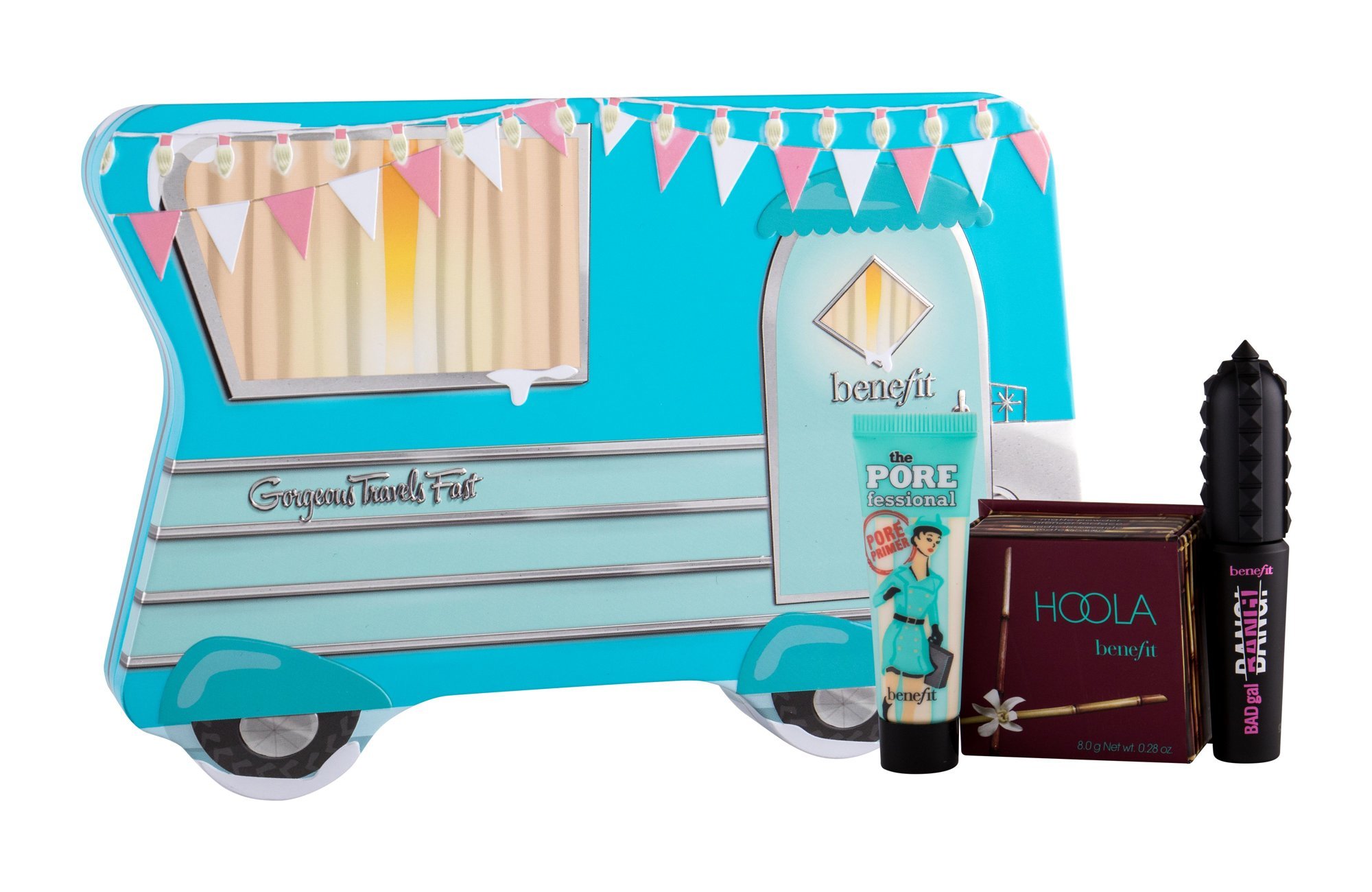 Benefit Hoola pudrový bronzer 8 g + řasenka Bad Gal Bang 4 g Pitch Black + podkladová báze pod makeup Pore Primer 7,5 ml + plechová krabička