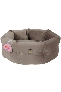 Krásný polstrovaný pelíšek z prémiové sametové tkaniny ve stylu Chesterfield s ozdobným kovovým štítkem. Na štítku je vyražené "C" zámku Chambord French Loire.