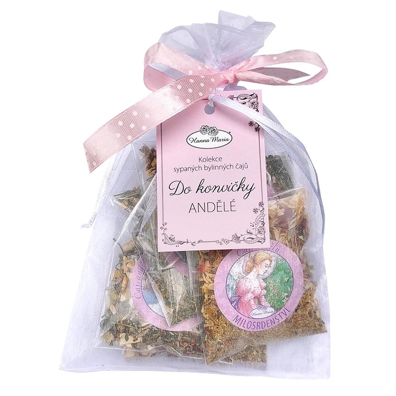 Krásu a prospěšné účinky ČAJŮ ANDĚLŮ ocení každý milovník bylinkových rituálů. Tyto hřejivé čaje obsahují sypané bylinky té nejvyšší kvality zpracování. Lahodné a laskavé čajové kompozice jsou krásným celoročním dárkem ke každé příležitosti.Bylinky v těchto směsích působí hojivě, odstraňují nahromaděné emoce a stres. Mají preventivní účinky a vliv na správné fungování celého organismu. Čaje mohou užívat děti i dospělí.