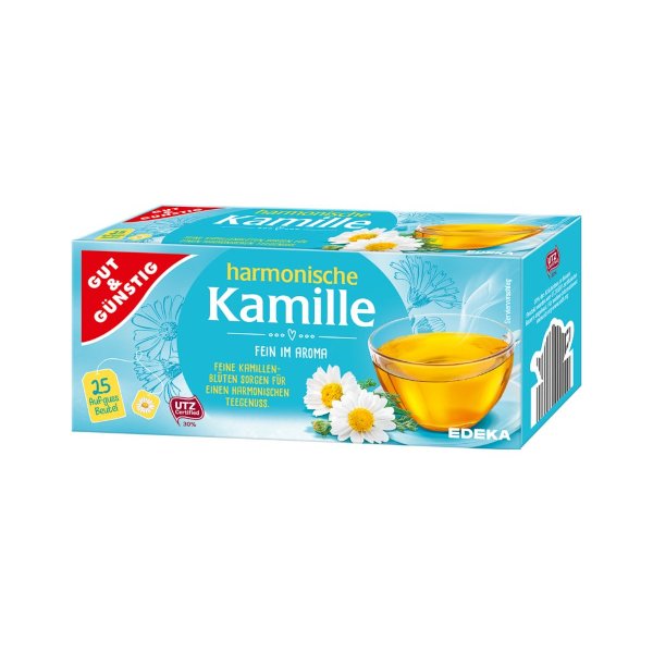 GG Heřmánkový bylinný čaj 25 sáčků, 37,5gHarmonický heřmánek je zdraví prospěšný pro tělo. Zklidňuje a pomáhá usnadnit usínání. Vyrobeno v Německu.Zalévejte vždy vařící vodou a nechte louhovat minimálně 5-6 minut. Složení: heřmánek. Důležité: Pro 1 šálek použijte 1 sáček (200ml) a minimálně 3...