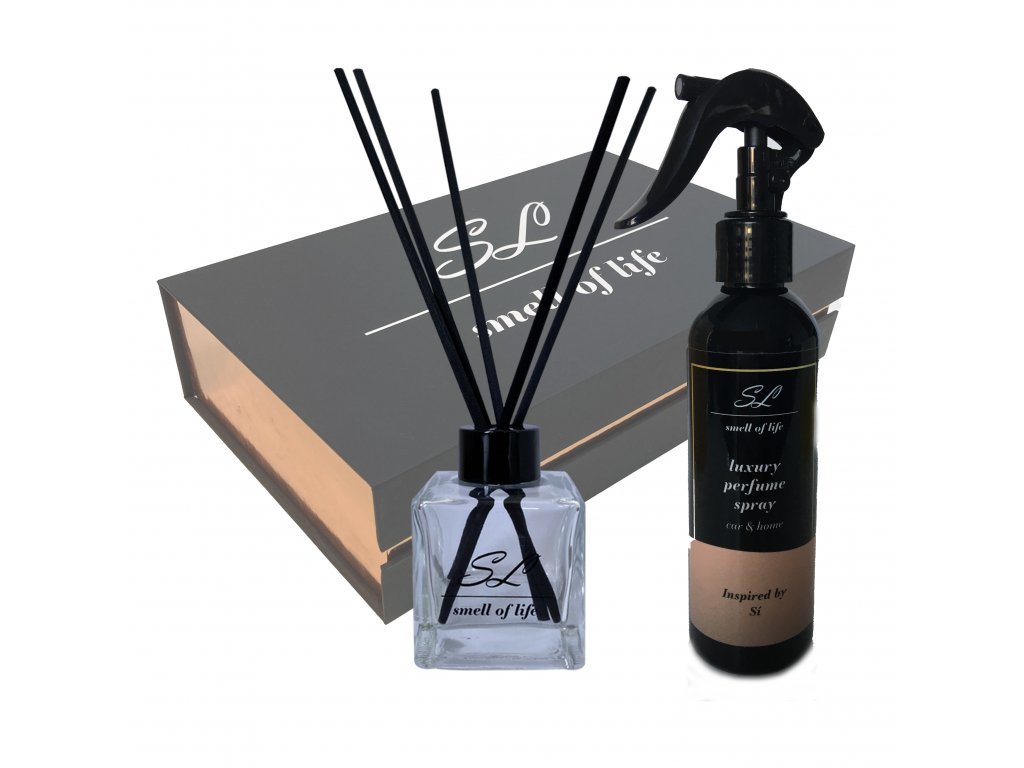 Dárková sada vonného difuzéru a parfému pro byt/auto ve formě rozprašovače inspirovaných vůní parfému SÍ v luxusní černé krabičce s růžovým zlatem je ideálním dárkem pro ženu.  prečítať celé