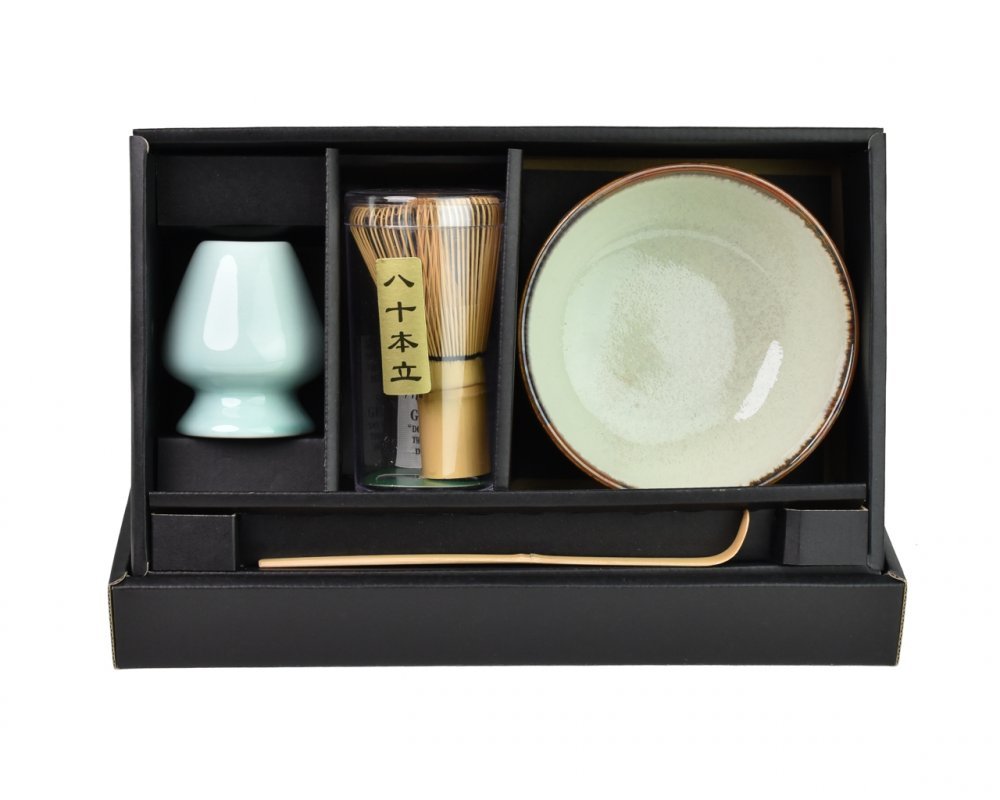 Set tvoří kameninová miska, bambusová lžička na matchu Chashaku, bambusová metlička Chasen a keramický stojánek na Chasen nazývaný Kusenaoshi. Set je vhodný pro přípravu matcha čaje způsobem usucha (jemný, lehký čaj) a koicha (hutný, silný čaj).