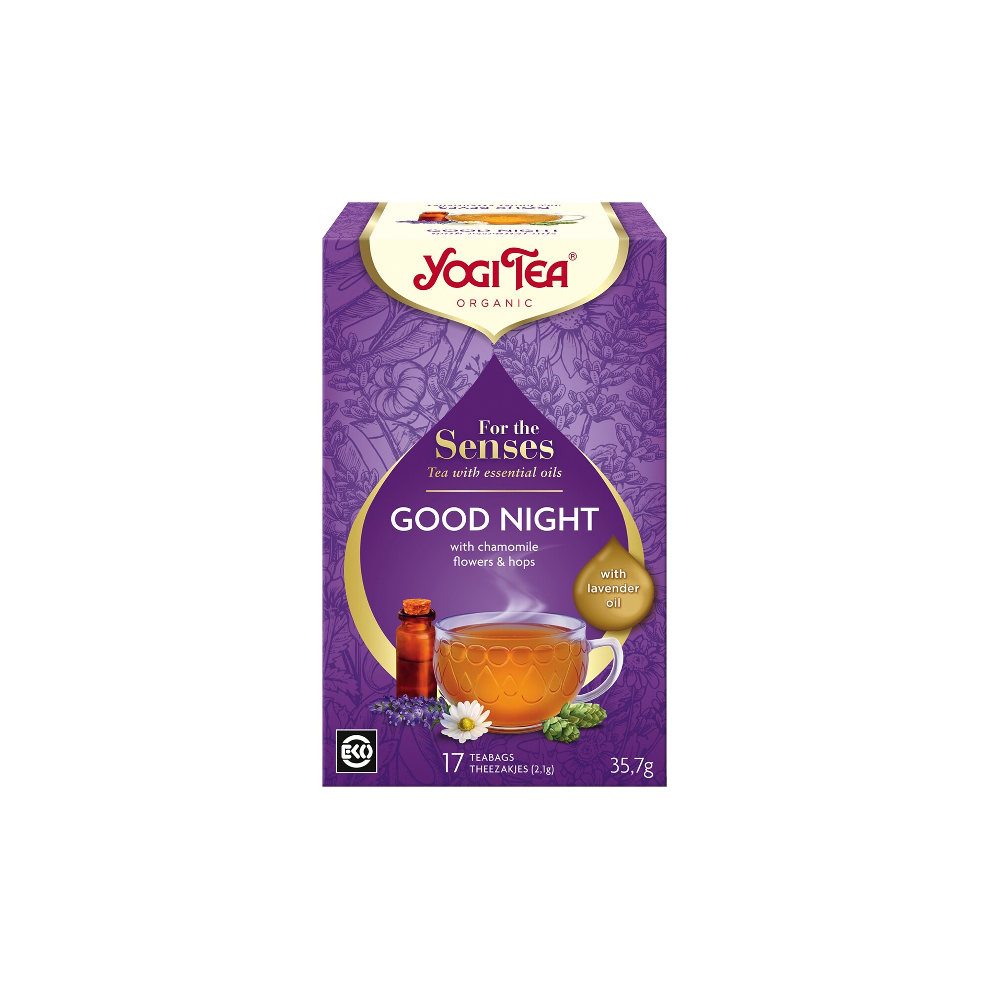 Fenykl, máta peprná, citronová tráva, květy heřmánku 18 %, meduňka, šalvěj, květy levandule 5 %, kardamom, chmel 1,5 %, levandulový olej 1,4 %, muškátový oříšek. produkt kontrolovaného ekologického zemědělství
