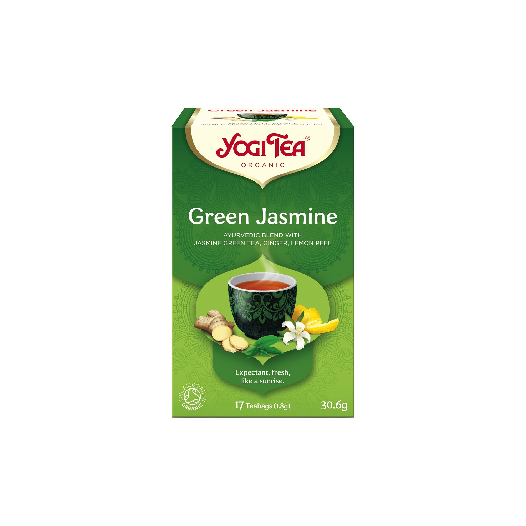 Jasmínový zelený čaj (zelený čaj, květy jasmínu) 47 %, zázvor 26 %, lékořice, citrónová tráva, citrónová kůra 4 %, černý pepř, verbena citrónová. produkt kontrolovaného ekologického zemědělstvíKalorická hodnota/energie (na 100ml):0kJ/0kcal. Tuky: 0 g. z toho nasycené mastné kyseliny: 0 g....