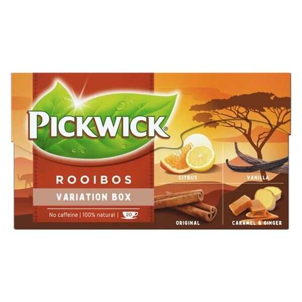 Porcovaný bylinný čaj Rooibos Variace, 20 sáčků ve čtyřech příchutích ;Bylinný čaj rooibos s kořením a Bylinný čaj rooibos aromatizovaný s citrusovým oplodím / s částečně extrahovanou vanilkou / se zázvorem a přírodním aromatem karamelu;20 nálevových sáčků v balení po 1,5 g