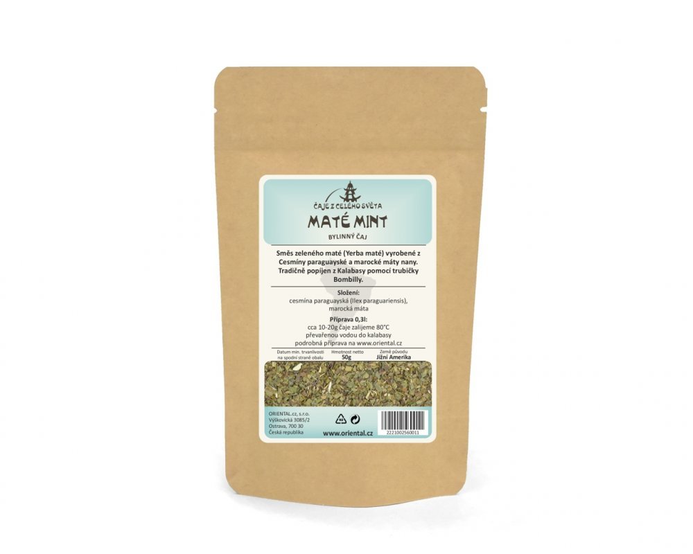 Zelené mate, typický nápoj Paraguajských indiánů. Vyrábí se z Cesmíny paraguayské (Ilex paraguariensis) a bývá popíjeno ze zvláštní nádoby kalabasy pomocí trubičky bombilly. V Jižní Americe má popíjení maté dlouho a pevnou tradici.Složení: Cesmína paraguayská (maté), marocká máta nana (mentha...