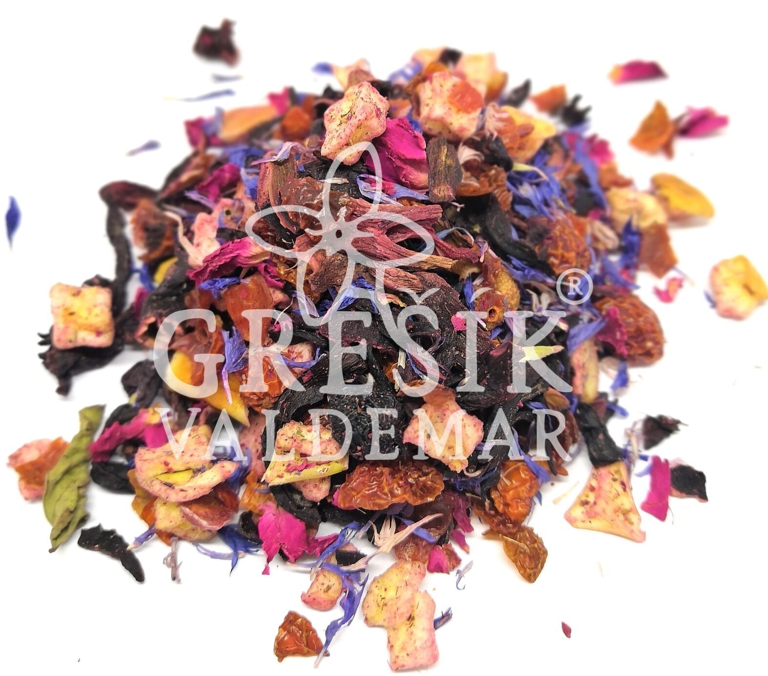 Složení: ibišek súd. květ, jablka 23 %, šípek, aronie plod, růže stolistá květ, černý rybíz plod 4 %, chrpa květ 3 %, višeň plod 2 %, přírodní aroma