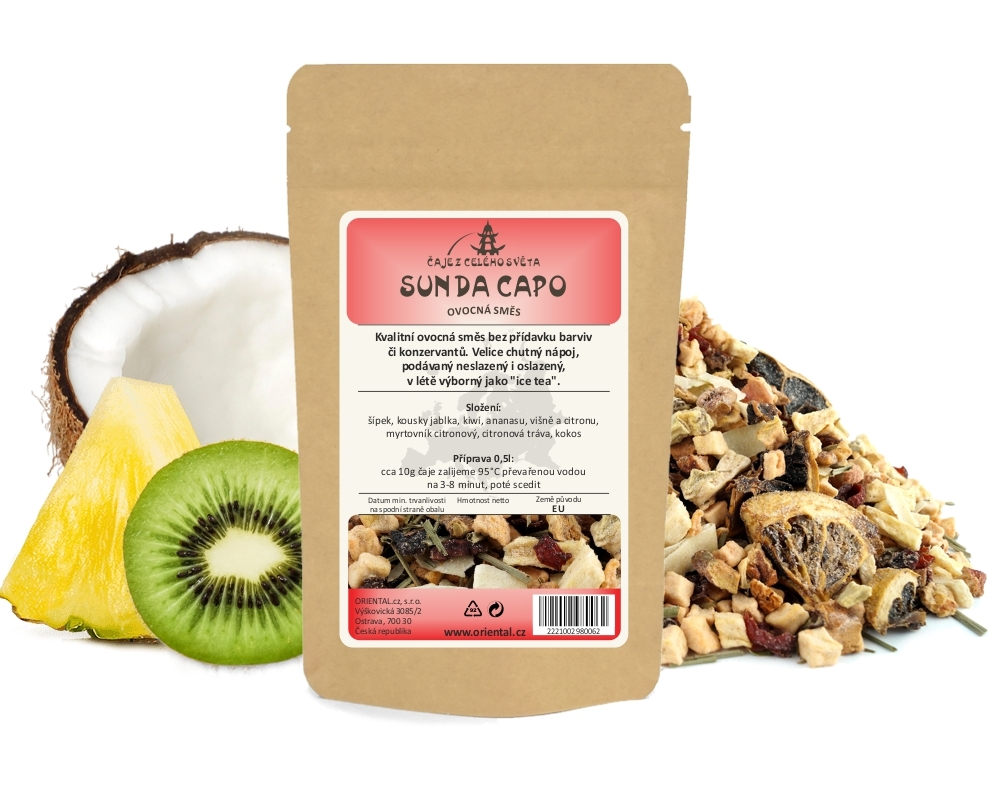 Složení: šípek, kousky jablka, kiwi, ananasu, višně a citronu, myrtovník citronový, citronová tráva, kokos.