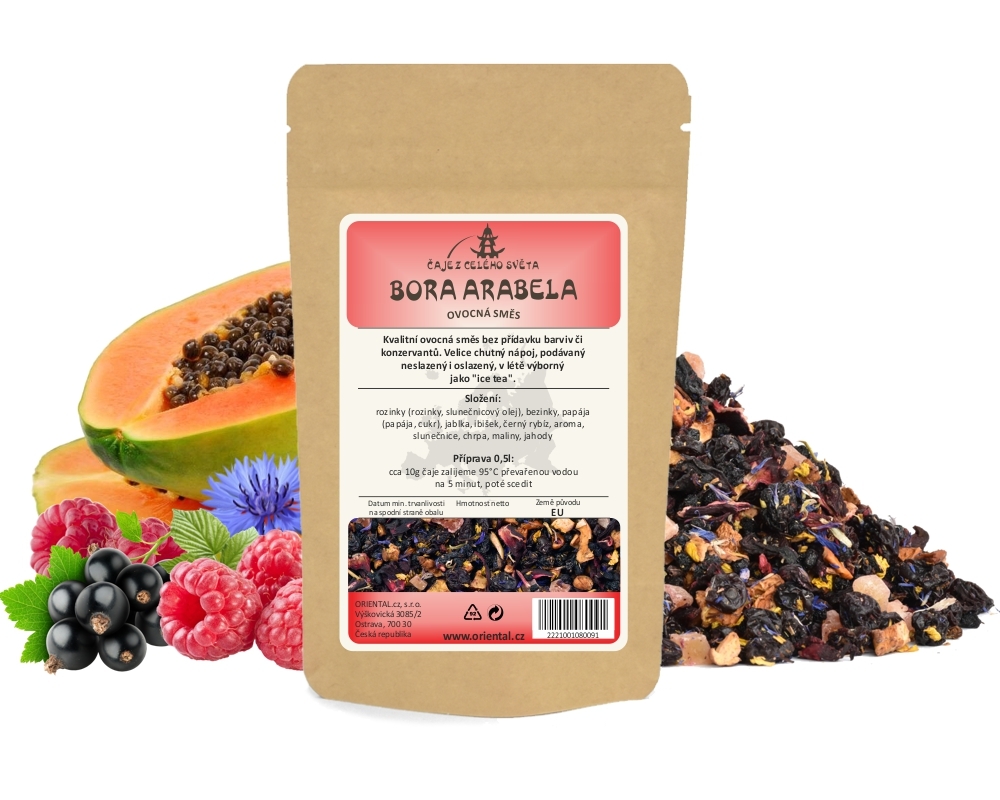 Kvalitní ovocná směs s ibiškem pro přípravu ovocného čaje.Složení: rozinky (rozinky, slunečnicový olej), bezinky, papája (papája, cukr), jablka, ibišek, černý rybíz, aroma, slunečnice, chrpa, maliny, jahodyPříprava 10g čaje v 0,5l konvičce:nálev: voda o teplotě cca 95°C, louhovat 3 až 8 minut.