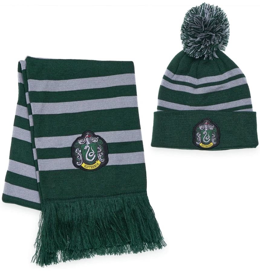 Zeleno-bílý zimní set s čepicí a šálou a grafikou školní koleje Slytherin.