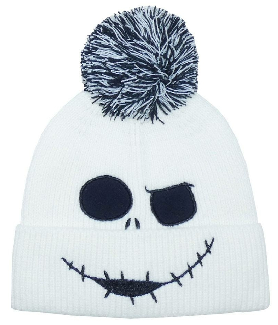Bílá přeložená zimní čepice s bambulí a motivem postavy Jack z filmu Ukradené Vánoce.