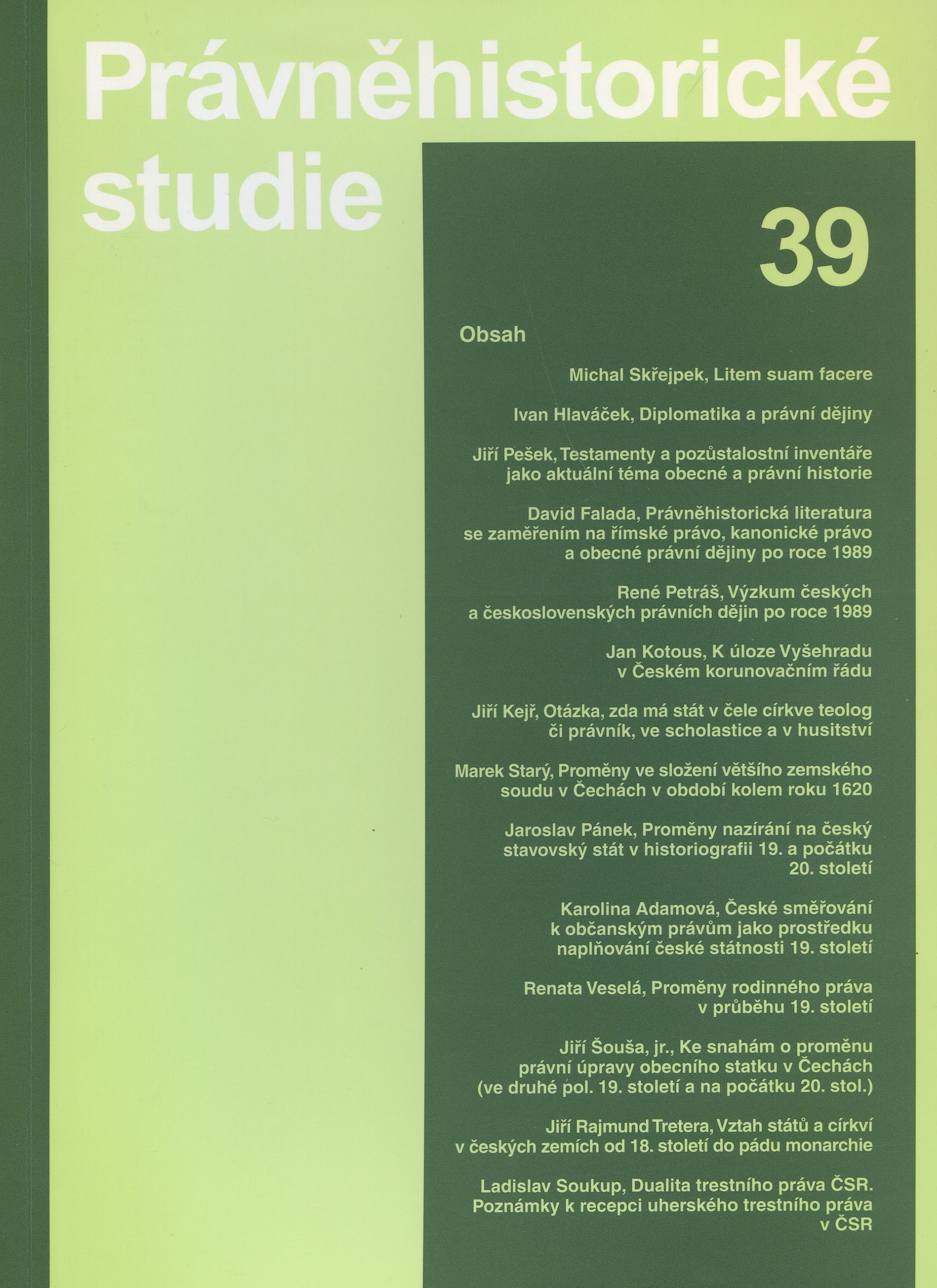 - číslo Právněhistorických studií je věnováno životnímu jubileu (75. narozeninám) dlouholetého předsedy redakční rady tohoto pravidelného sborníku, ředitele Ústavu právních dějin PF UK a emeritnímu rektoru Prof. JUDr. Dr.h.c. Karlu Malému, DrSc. Jde o soubor prací převážně z českých a československých právních dějin, kterým se oslavenec profesně věnuje. Patří k nim tématicky starší studie o testamentech J. Peška, o korunovacích českých panovníků na Vyšehradě od J. Kotouse, o případné právnické kvalifikaci kandidátů papežství od J. Kejře, dále studie J. Pánka o změnách názorů na stavovský stát u badatelů 19. století nebo studie o povaze obecních statků podle rakouského práva J. Šouši ml. Časově s nimi koresponduje studie L. Soukupa o vývoji pramenů trestního práva v Uhrách, K. Adamové o české státnosti a J.R. Tretery o vztazích státu a církve v českých zemích. Stejnou otázku, avšak v době první ČSR zkoumá Z. Horák, K. Zavacká pojednává o ústavních zárukách rovnosti občanů, P. Mosný a P. Mates se zabývají problematikou rovněž z této mladší doby, podobně i M. Tomášek v příspěvku o české právní historii a doktríně evropského práva.jinách práva a spolu s právem římským a kanonickým - D. Falada - jednak v českých a československých právních dějinách - R. Petráš. Obecnější i užšší témata mají i studie dalších autorů. Mimo českou právní historii se řadí práce M. Skřejpka o odpovědnosti soudce za chybně vydaný rozsudek v římském právu, R. Seltenreicha o ústavněprávním vývoji USA a P. Skřejpkové o právní úpravě námořního obchodu.