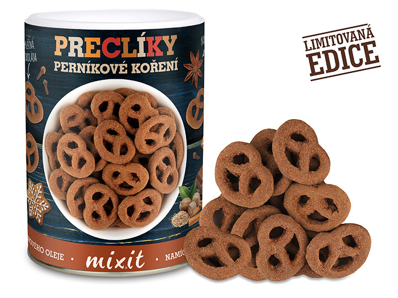 Limitovaná Vánoční edice. Je tu Vánoční preclík uloupnutý z perníkové chaloupky. :-) Přikutálel se k nám a chutná prostě pohádkově. Pod bohatou vrstvou mléčné čokolády a omamně voňavého perníkového koření se skrývá jemně solený a dozlatova vypečený preclík. Stačí otevřít víčko tubusu a ucítíte...